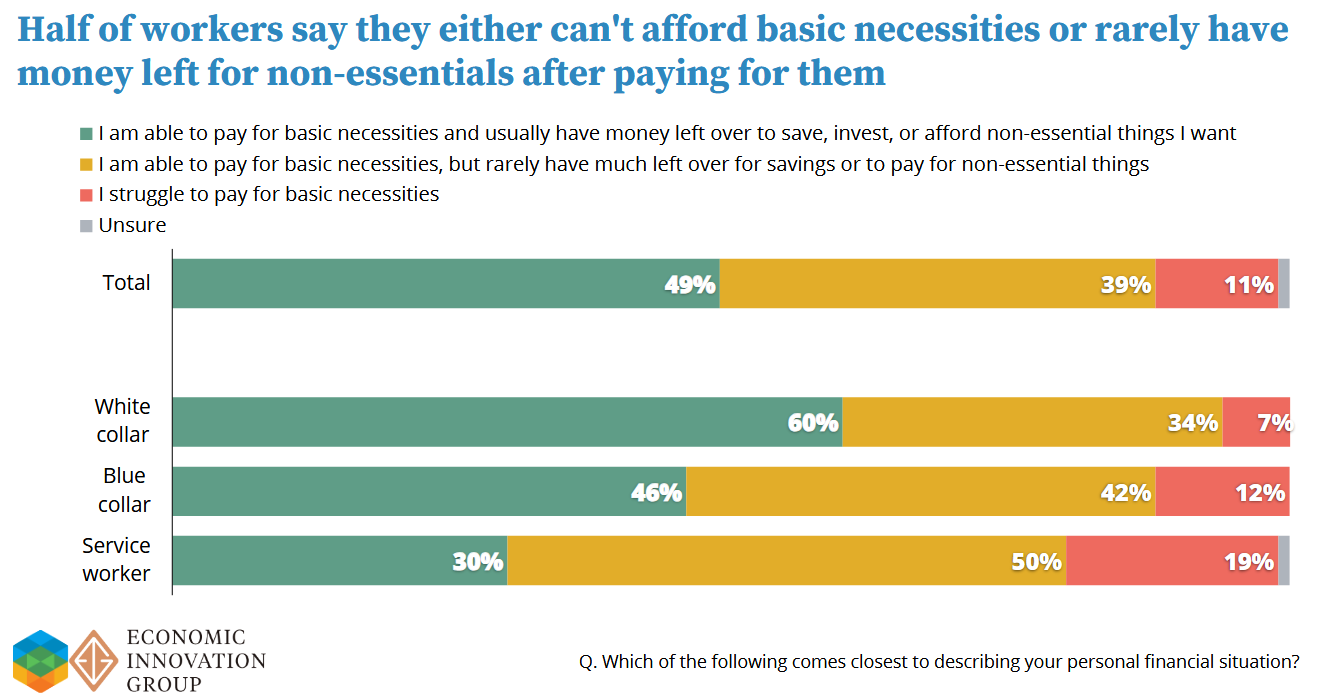 This report finds that only about half of the surveyed respondents can pay for essentials with enough money left over for savings, investments, and non-essentials: