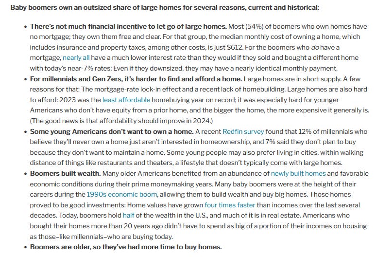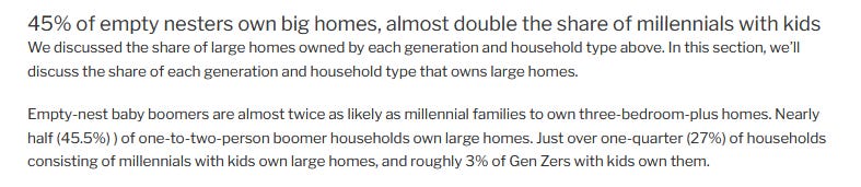 It’s easy to think of this as people making decisions and get caught up in intergenerational warfare. But the last 1/4 century has seen such a wild whirlwind of trends: the collapse of housing construction, good jobs concentrating in unaffordable places, inequality growth, changes in family demographics. Lots of feelings of precarity. Retirement years can be pretty darned uncertain and precarious - makes sense to me why older adults wouldn’t change homes on a whim. I interpret this story less as a generation war and more of an example of many socioeconomic, social, and political moments not being met over decades, resulting in pretty stark cohort patterns.