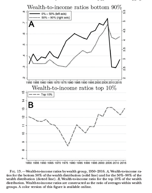 But here’s what caught my attention: wealth to income ratios at different distributional locations (e.g. your wealth is $2,000, your income is $1,000, your wealth to income ratio is 2000/1000=2).